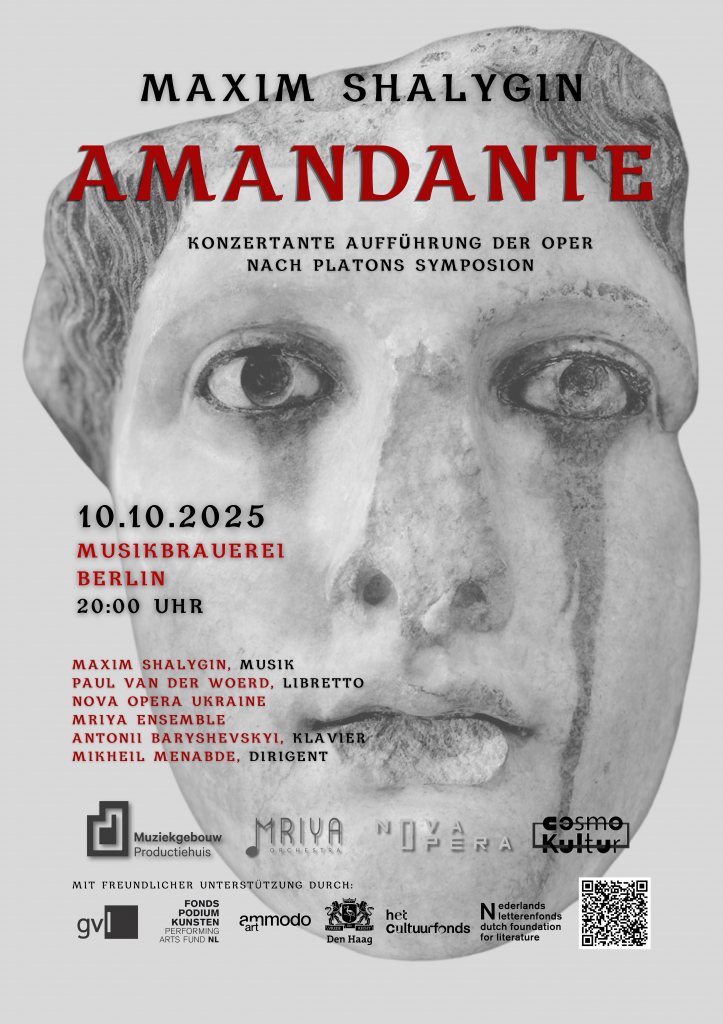 Amandante ist ein Meilenstein: die erste Oper des niederländisch-ukrainischen Komponisten Maxim Shalygin. Ursprünglich für eine Premiere in Kiew im Jahr 2022 geplant, wurde sie aufgrund des Krieges in der Ukraine abgesagt. Nach zweieinhalb turbulenten Jahren für das ukrainische Vokal-Instrumental-Ensemble NOVA OPERA feierte Amandante schließlich 2024 im Muziekgebouw Amsterdam Premiere und ist jetzt zum ersten Mal in Berlin zu erleben.